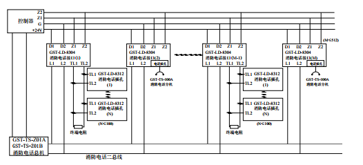 布線要求:Z1、Z2采用截面積≥1.0mm2的阻燃RVS雙絞線,DC24V電源線采用截面積≥1.5mm2的阻燃BV線,TL1、TL2、L1、L2采用截面積≥1.0mm2的阻燃RVVP屏蔽線。